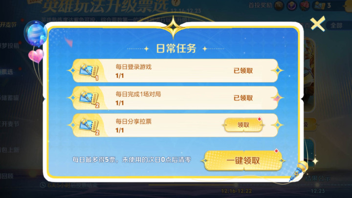 每个玩家每天都有5次投票机会,登录游戏完成对局并且进行分享,就可以获得这5次投票机会。投票之后,还可以拿到一些蚊子腿的奖励。