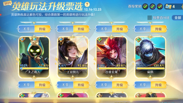 这次进入投票池的都是近两年没有玩法升级并且各个分段出场率低于6%的英雄。官方桑玩家投票,票数最高的英雄,在明年将会进行玩法升级。