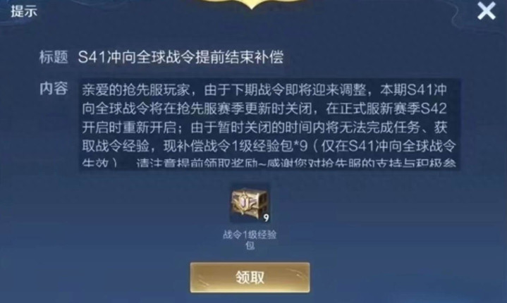 王者荣耀S41赛季的战令可能会提前结束,如下图所示,这是近期王者荣耀抢先服的公告。因为下一期的战令会迎来调整,所以S41赛季的战令会提前结束,也对玩家做出了补偿,就是9个战令一级经验包。