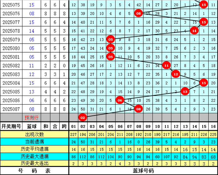 上期开奖:福彩双色球第2025087奖号为:02 06 14 15 24 26 + 08,红球和值为87,最大间距为9,奇偶比为1:5,三区比为2:2:2。