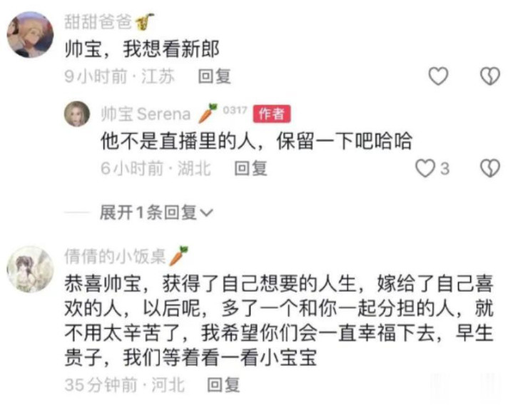 对于这个要求,帅宝表示自己的新郎不是直播里的人,还是保留一下吧。其实帅宝的这种做法还是很正确的,毕竟自己作为一名主播,还是要保护一下另一半的隐私的,但是此时评论区却出现了一些不好的声音。