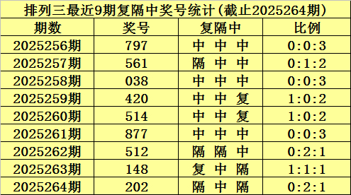 上期回顾:排列三第2025264期奖号为:202。大小比为0:3,奇偶比为0:3,012路比为1:0:2。