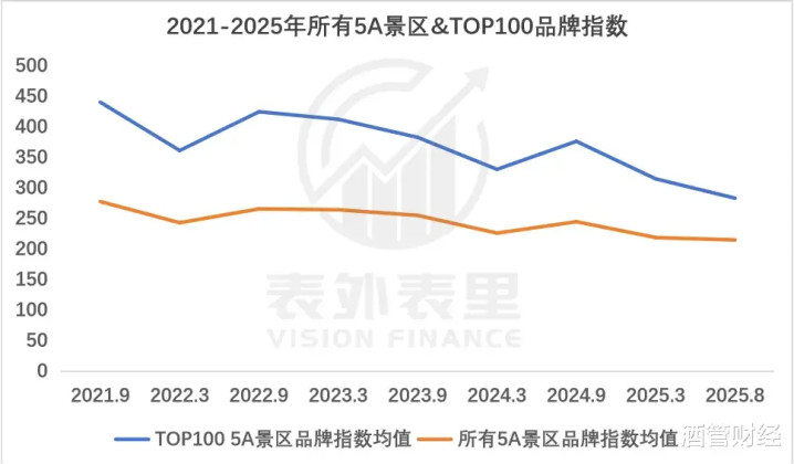 最近4年,Top100的5A景区的品牌指数,已经腰斩了。
