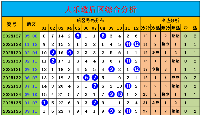 上期回顾:大乐透第2025136期:前区07、11、15、16、23,后区09、11,前区奖号和值为72,三区比为2:3:0,后区开出热热组合09、11