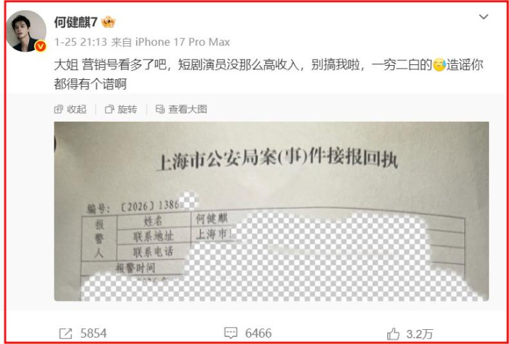 相较于举报内容的劲爆,何健麒的回应更显荒诞,他先是晒出报案回执,吐槽“短剧演员没那么高收入,造谣都得有个谱”,试图用穷弱化争议,随后工作室发声明追责诽谤。