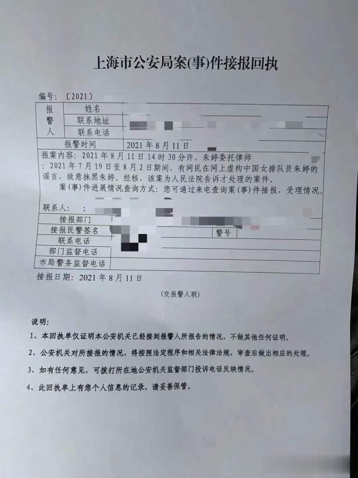 2021年8月11日,朱婷曾委托律师,对于“2021年7月19日至2021年8月2日期间”网络上虚构她的谣言、故意抹黑她的行为,向公安机关报案。