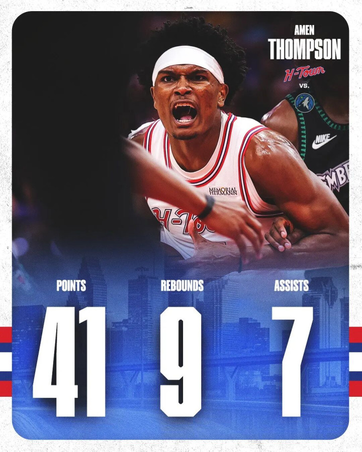 首轮无缘主场优势挺可惜,但这场比赛,火箭球星阿门汤普森打出了非常炸裂的表现:全场出战42分钟,投篮22中17,罚球7中7,拿下41分9篮板7助攻2抢断。