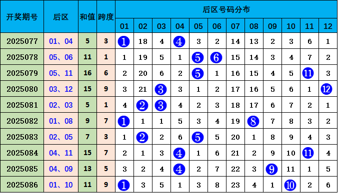 后区分析:上期后区开出01 10,跨度9,近十期跨度是:3、1,6、9、1、7、3、7、5、9,波动范围较大,跨度范围在1-9之间,本期预计跨度值下降,重点关注号码03 05,跨度2。