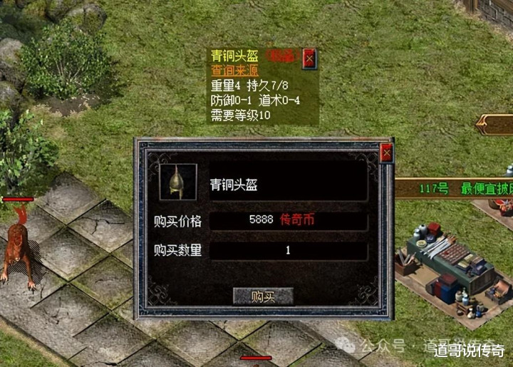 比起前面的头盔,上图中的青铜头盔是来劲了,它足足加了4点道术属性,这也是除看不见的神秘头盔之外头盔加道术的巅峰。对于运九套道士而言,这个输出效果确实霸气,缺点也很明显,接近光秃秃防守效果不适合道士。更何况道士多搭配敏捷套装,黑铁头或者道士头更适合一些。这道4青铜头盔能摆摊5888已经很了不得了。
