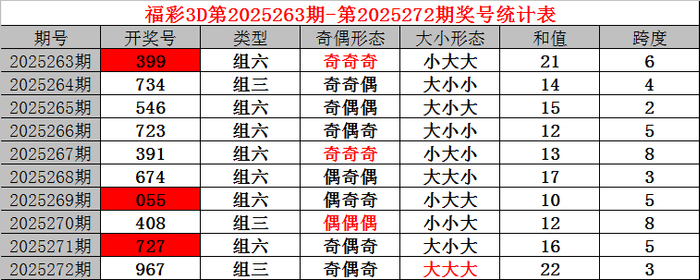 上期回顾:福利彩票3D第2025272期开奖结果967。奖号:奇偶奇、大大大,和值22,跨度3。