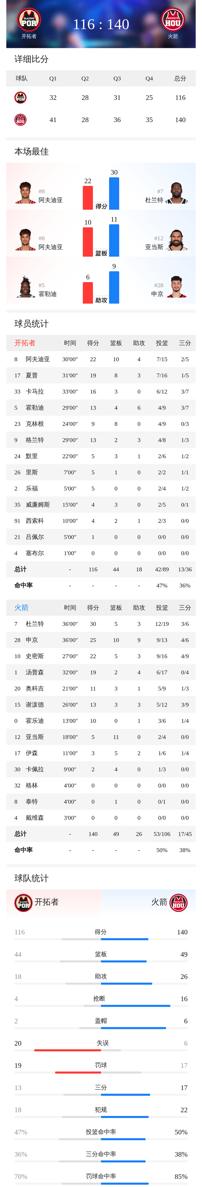 火箭:杜兰特 36分钟砍下30分,12中19(63.2%)的恐怖效率,正负值+28冠绝全场;申京9助攻0失误,三分6中4(66.7%)展现全能身手。