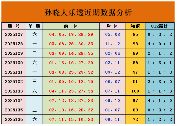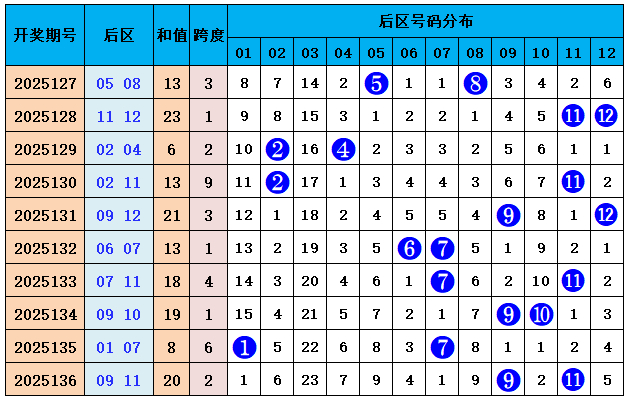 上期回顾:大乐透第2025136期奖号:前区07、11、15、16、23,后区09、11,前区奖号和值为72,三区比为2:3:0,后区开出大大组合09、11